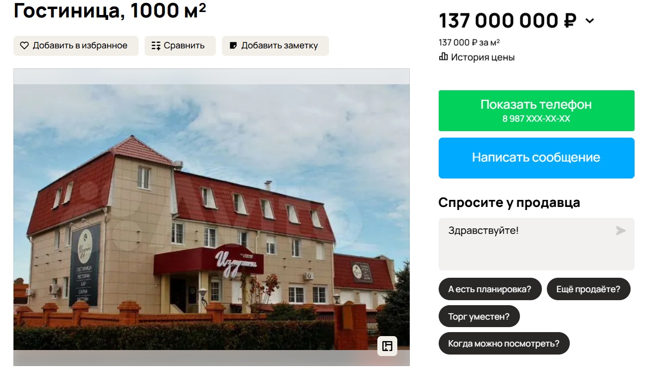 Скриншот: Avito.ru В Волгоградской области за 137 млн рублей продают гостиницу «Излучина».