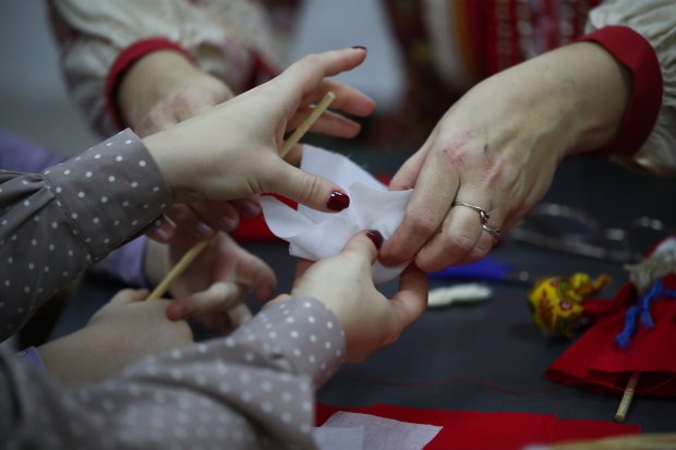 – К нам приходят дети, взрослые, которые интересуются рукоделием. Мы знакомим гостей с русскими народными традициями, вещами, которые украшают нашу избу, и, конечно, проводим мастер-классы, где изготавливаем народные куклы, они могут быть разные – игровые, обереговые, – рассказала Людмила Лихачева, мастер клуба народной куклы «Крупеничка» при ВМИИ им. И. И. Машкова. – По традиции первые куклы были безшитьевые, создавались с помощью ткани и ниток, которые заматывались. Сейчас на основе традиционных приемов мастера создают свои куклы-образы. Вот сейчас мы создаем «Деда Мороза». Это тоже кукла-образ, здесь использованы народные приемы. Такой куклы в старину не было, но сейчас мастера создали такую красивую игрушку. Это игровая кукла для детей, она на палочке, и ей можно играть, украсить дом, елочку.