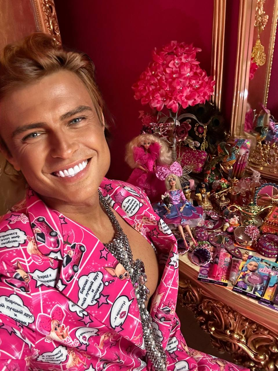 Пока жители Волгоградской области ожидают, когда смогут посмотреть на большом экране нашумевшую кинокартину "Барби", Прохор решил порадовать фотографиями в розовой тематике. На фотографиях артист сияет белозубой улыбкой, полностью повторяя образ белокурого и голубоглазого кена. Интерьер вокруг сильно напоминает кукольный домик.