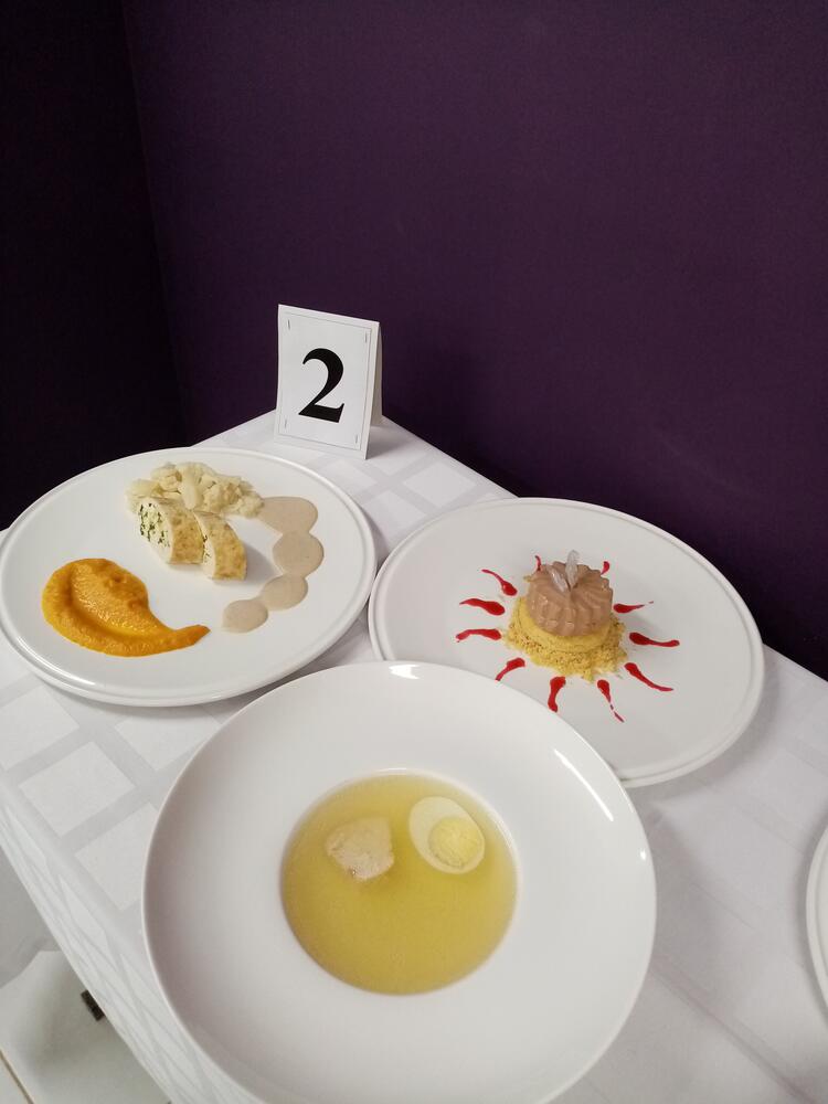 1 модуль — горячее блюдо из курицы с двумя гарнирами и соусом; 2 модуль — холодный десерт – мусс с выпеченным элементом из теста, холодным соусом и декором из изомальта; 3 модуль — прозрачный бульон (консоме) из курицы с гарниром.Все ребята достойно справились с заданием!
