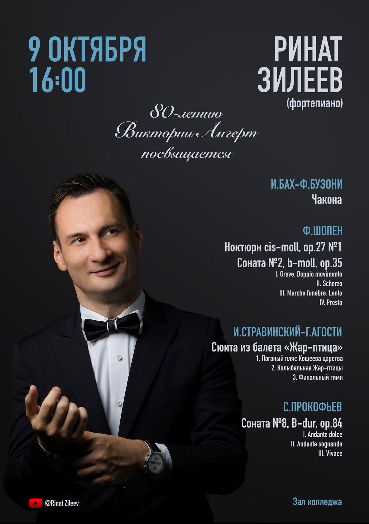 9 октября в 16:00 в зале колледжа состоится концерт Рината Зилеева , посвященный 80-летию своего педагога Виктории Вениаминовны Ангерт.