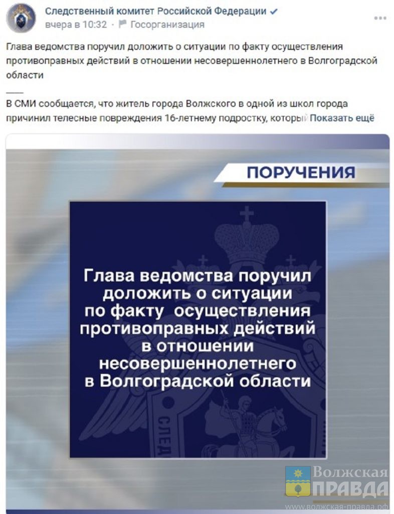 Фото: скриншот с группы ВКонтакте СУ СКР Волгоградской областиВ настоящее время десятиклассник, получивший травму головы, выписан из больницы и восстанавливается дома. Девочка, оказавшаяся в эпицентре конфликта, на занятия так и не вышла. Её документы родители из школы забрали, и в настоящее время подбирают ей другое учреждение образования.