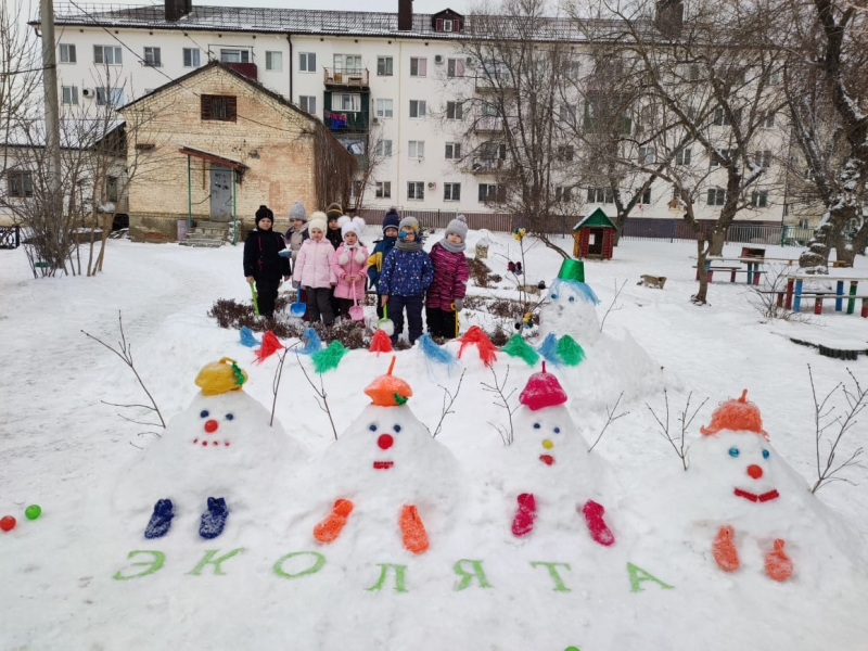 Так в МКОУ «Медведицкая СШ» в снежном городке Эколят сказочные персонажи Тихоня, Шалун, Ёлочка и Умница напоминают ребятам и взрослым о том, что зимой необходимо подкармливать птиц. В школьном дворе висят кормушки, сделанные детьми и их родителями. Эколята приглашают ребят всех возрастов в свой городок. Здесь юные экологи проходят лабиринты, выполняют интересные задания, узнают много нового и интересного об окружающей среде и охране природы.Приходите в наш ,,Снежный городок Эколят!» А в ДОУ МДС №2 «Тополёк» г. Жирновска воспитанники подготовительной группы с воспитателями и младшим воспитателем сделали снежную композицию. Вы узнали…? Это же герои эколят: Шалун, Тихоня, Умница и Елочка. Зима в этом году не щедра на снег, но так хочется из чистого снега поиграть в зимние забавы. Работали дружно, шумно… Результат порадовал всех.
