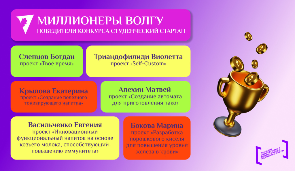 Таким образом, успех студентов Волгоградского государственного университета на этом конкурсе показывает, что молодежь готова к новым вызовам и способна реализовывать свои амбиции в предпринимательской сфере.