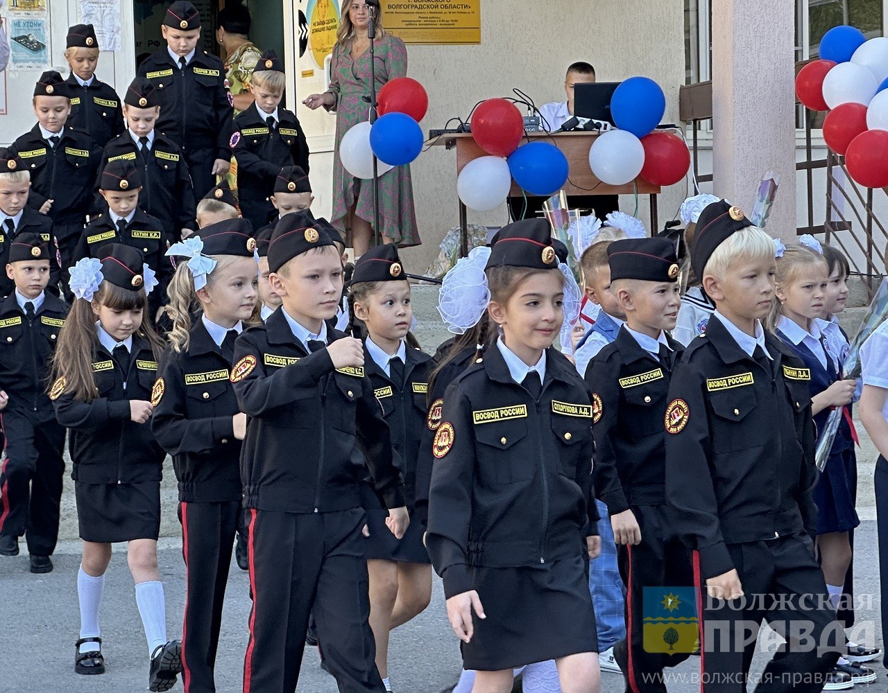 В 2023 году их три класса. Ученики 1 «Б» вместе со своим учителем пришли в специальной форме – чёрных костюмах с нашивками, где значится фамилия каждого ученика, и пилотках.