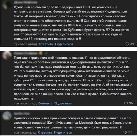 Кроме того, свердловчане заметили, что Куйвашев без уважения относится к участникам спецоперации по защите республик Донбасса и может тайно не поддерживать СВО. При этом большинство комментаторов указало губернатору на реальные проблемы региона, которые поднял в своем послании Пригожин. Многие местные жители требуют от чиновника покинуть пост главы Свердловской области.