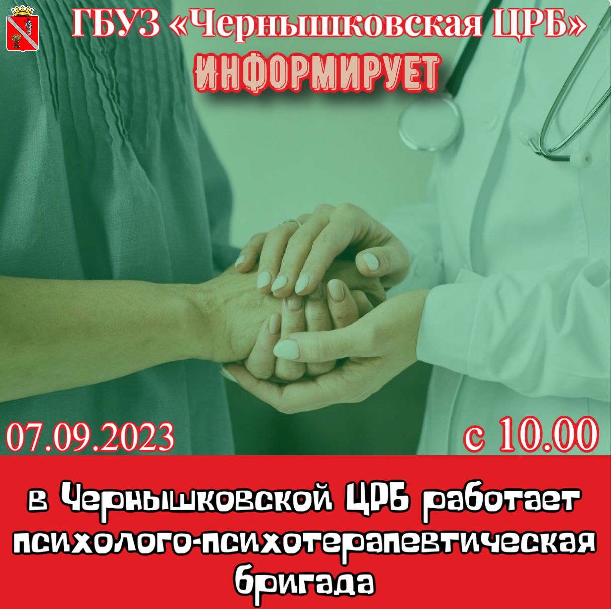 В четверг, 7 сентября. в 10:00:в Чернышковскую ЦРБ приезжает психолого-психотерапевтическая бригада.
