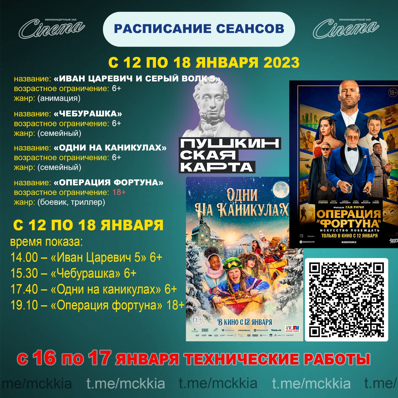 Уважаемые жители и гости района! В киноконцертном зале продолжается показ фильмов по "Пушкинской карте". За счет государственных средств можно посмотреть фильмы "Чебурашка" и "Иван Царевич и Серый Волк 5".