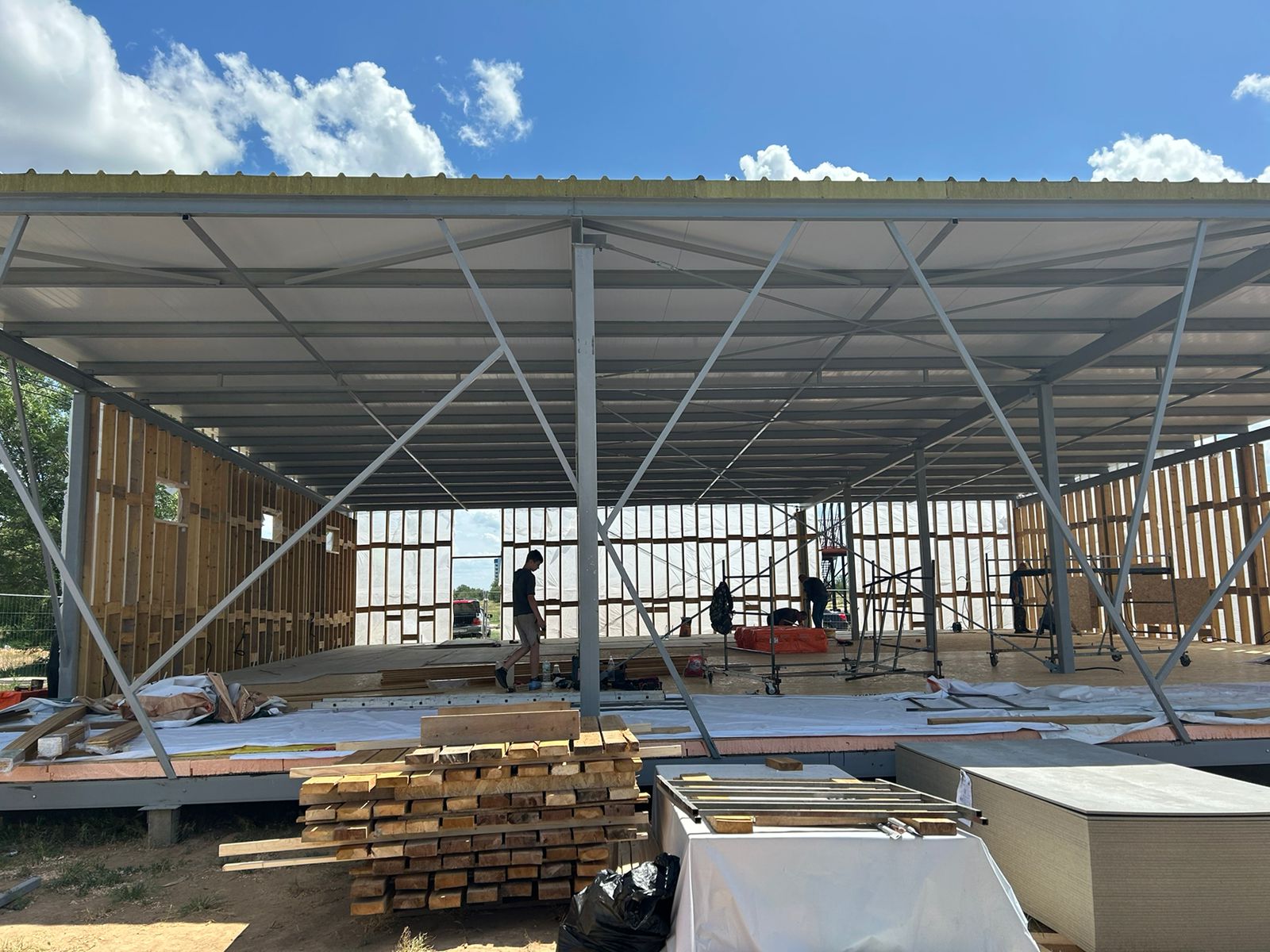 С начала апреля, когда стартовали работы по возведению молодежного центра, на площадке появился каркас из металлоконструкций, уже проведено устройство кровли, ведется облицовка стен фальшбрусом и настил полов. Параллельно монтируются системы электроснабжения, отопления, внутренние коммуникации.