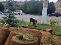 Вдоль ул. Рабоче-Крестьянской появляется зеленый «ковер» - агрономы укладывают рулонный газон на участке от ул.