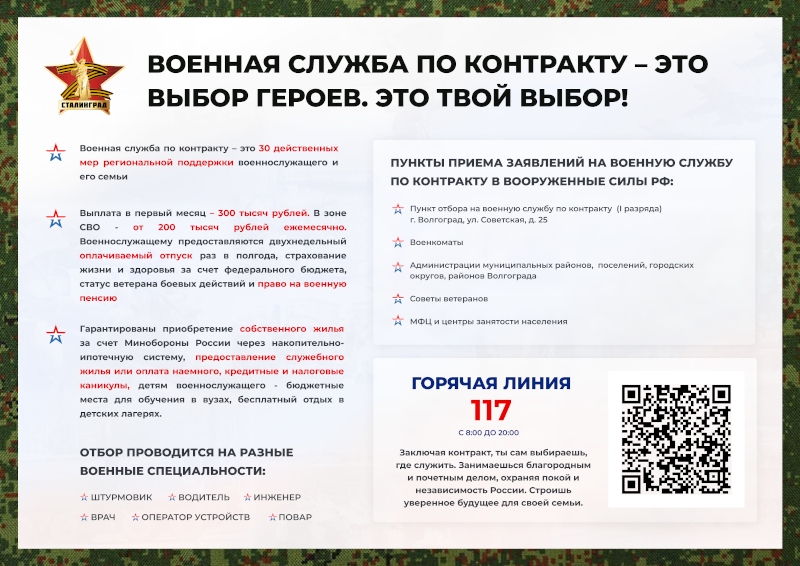 По интересующим вопросам можно обращаться в пункты отбора для заключения контракта на военную службу, которые расположены в администрации Чернышковского муниципального района, районном Совете ветеранов, МФЦ, Центре занятости населения и в администрациях каждого сельского поселения, а также по телефону горячей линии: 117 и к специалисту военного учётного стола администрации района Излигощиной Наталье Анатольевне по телефону: 6-15-31.