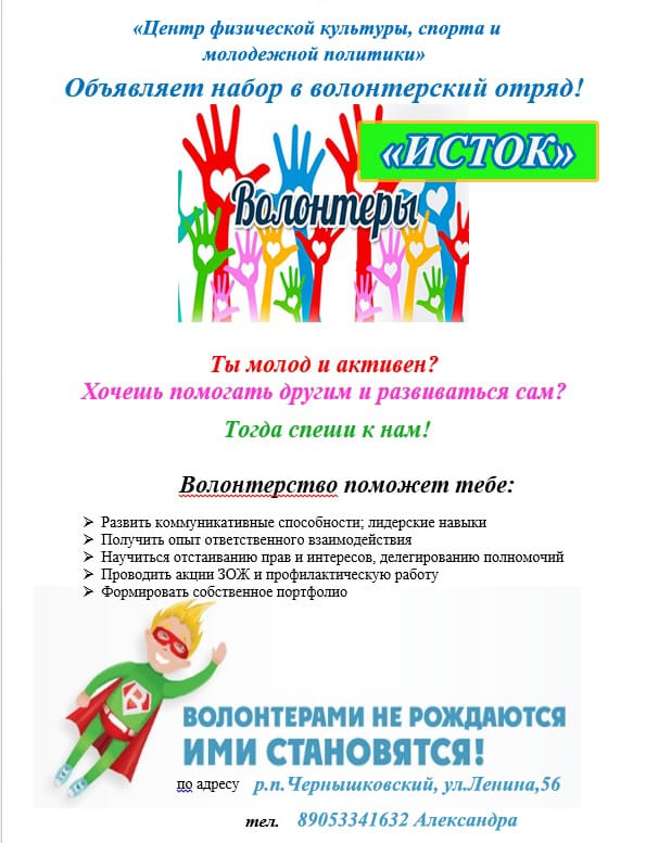 Дорогие ребята! Объявлен набор в волонтёрский отряд "Исток", действующий на базе Центра физической культуры, спорта и молодёжной политики.