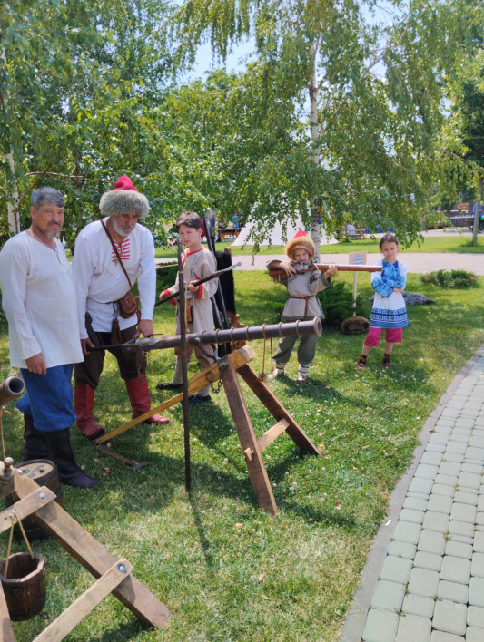 Гостей в исторических костюмах той далекой эпохи встречали Луночкин Михаил и Ушакин Михаил. С ними были и казачата: Арсений и Арина Луночкины, Коля Ушакин. Ребята провели для сверстников экскурсию по выставке, выступили инструкторами по стрельбе из лука и показали мастер-класс по стрельбе из исторических луков. Одеты они были так же, как и «старые казаки», что придавало экспозиции своеобразный шарм.