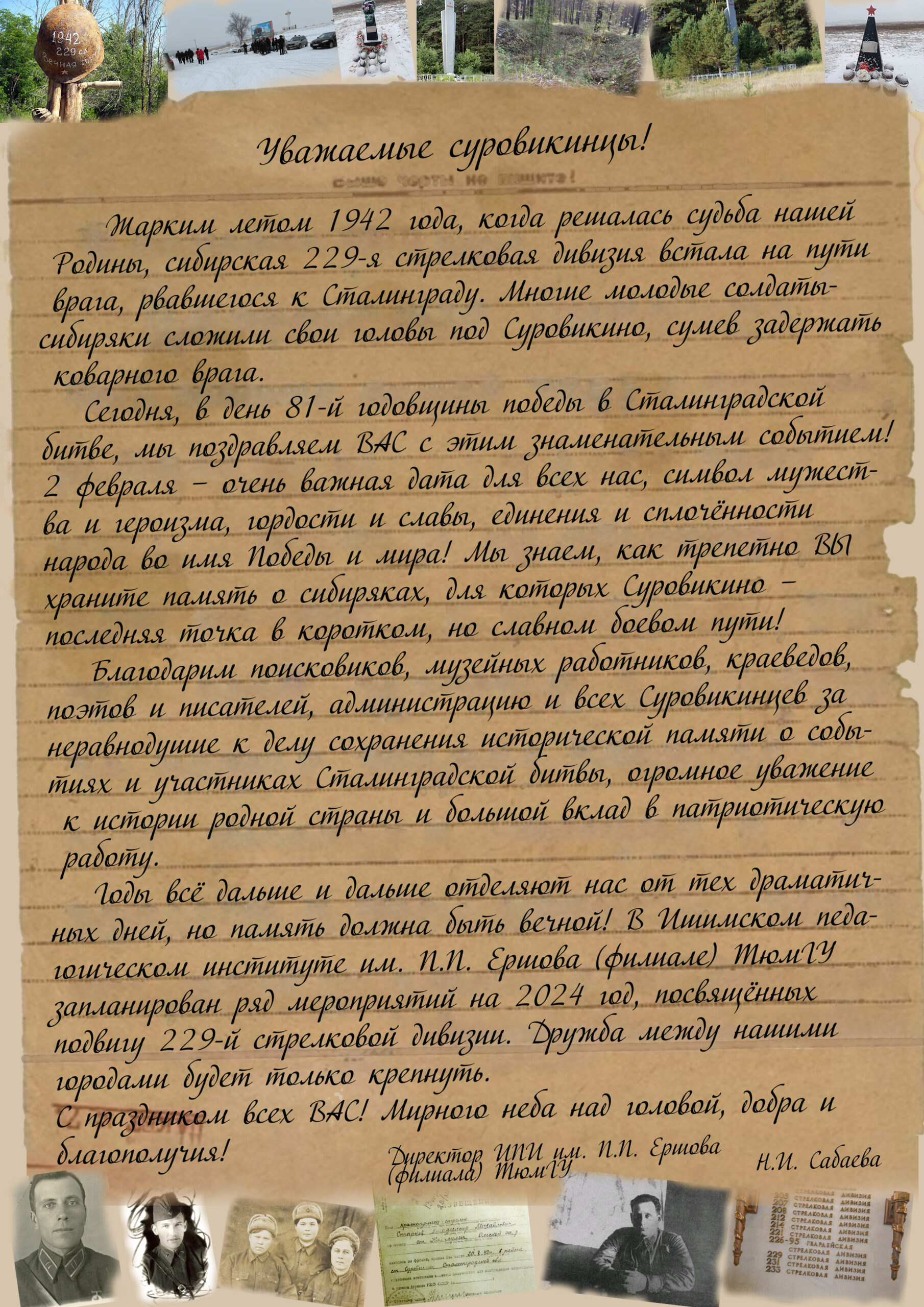 Сегодня, в день 81-й годовщины победы в Сталинградской битве, мы поздравляем ВАС с этим знаменательным событием! 2 февраля – очень важная дата для всех нас, символ мужества и героизма, гордости и славы, единения и сплочённости народа во имя Победы и мира! Мы знаем, как трепетно ВЫ храните память о сибиряках, для которых Суровикино – последняя точка в коротком, но славном боевом пути!