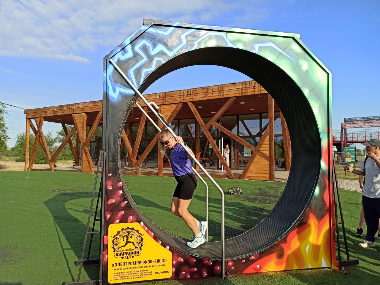 Новый яркий объект представляет собой беговое колесо, которое преобразует кинетическую энергию в электрическую, которую можно использовать для зарядки электронных устройств. Для этого на колесе смонтирован специальный разъем, а также два информационных табло, указывающих дистанцию и скорость бега.