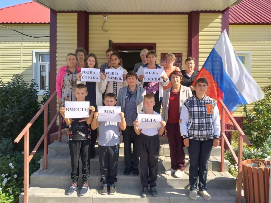 Юные жители села Верхняя Грязнуха приняли участие в патриотическом флешмобе «Вместе мы сила!», организованном Верхнегрязнухинской библиотекой совместно с сельским клубом. Специалист библиотеки Алла Марченко познакомила школьников с новой памятной датой. А затем ребята самостоятельно нарисовали плакат, где на фоне российского флага разместили слоган: «Одна страна, одна семья, одна Россия», показав единство, дружбу, солидарность со своими сверстниками из вошедших в состав Российской Федерации новых регионов.