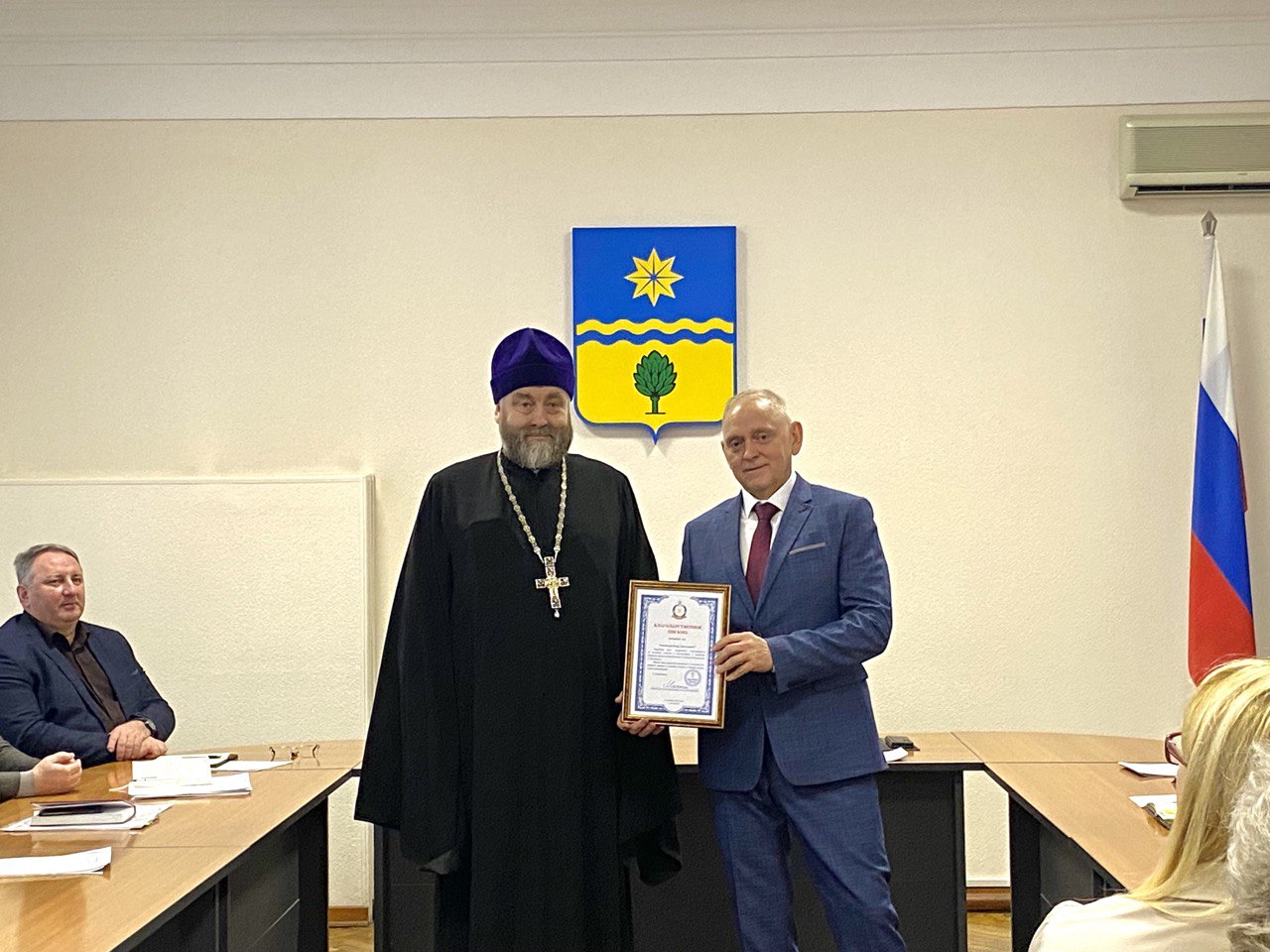 Также сегодня руководитель отдела религиозного образования и катехизации Калачевской епархии Петр Симора вручил главе Волжского благодарственное письмо епископа Калачевского и Палласовского Иоанна, отметив вклад города в обустройство и развитие прихода храма св. Георгия Победоносца.