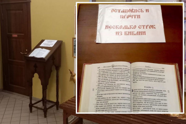 В притворе Никольского собора КамышинаВ притворе собора установлен аналой, на котором лежит Священное писание. Надпись вверху гласит: «Остановись и прочти несколько строк из Библии». Лучше, конечно, главу.