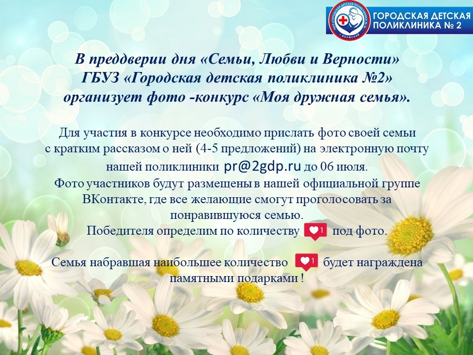 В преддверии дня «Семьи, Любви и Верности» ГБУЗ «Городская детская поликлиника №2» организует фото -конкурс «Моя дружная семья».