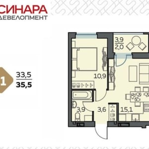 - Общая площадь: 35.5 м²