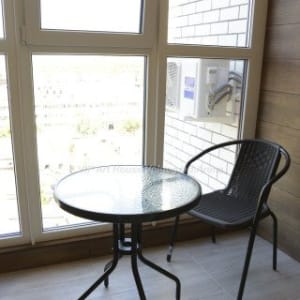 - Лоджия с плетеным креслом и кофейным столиком.